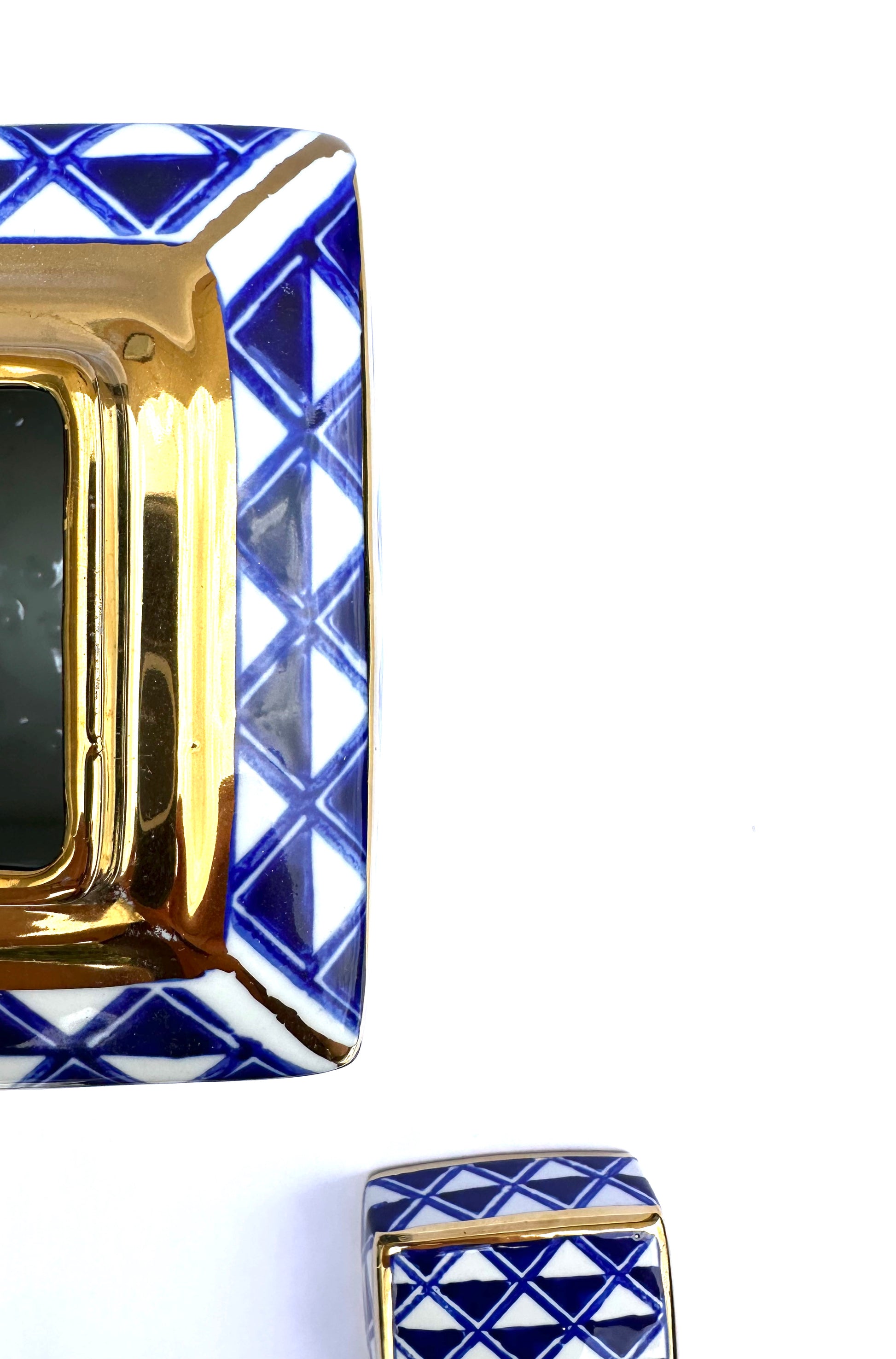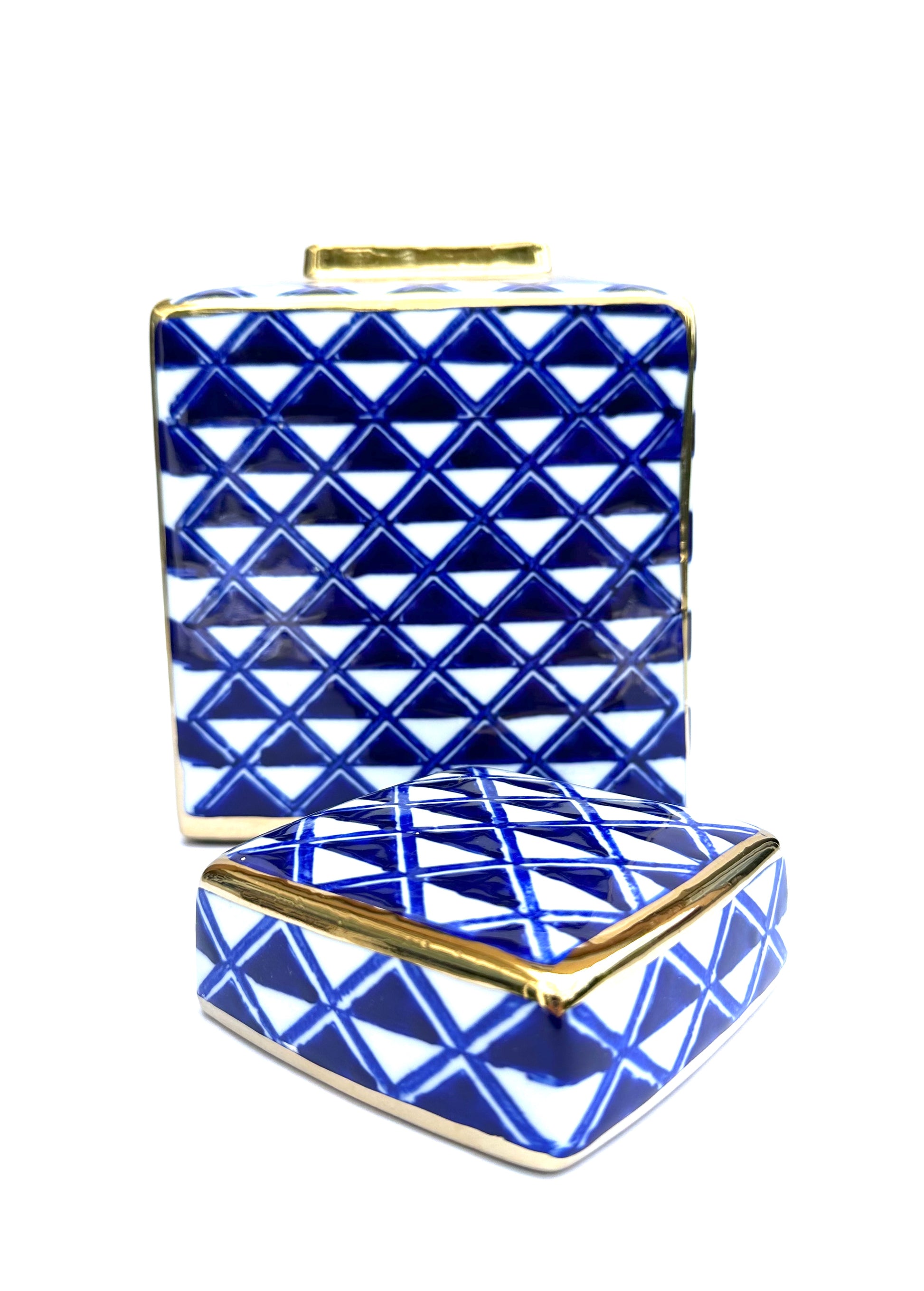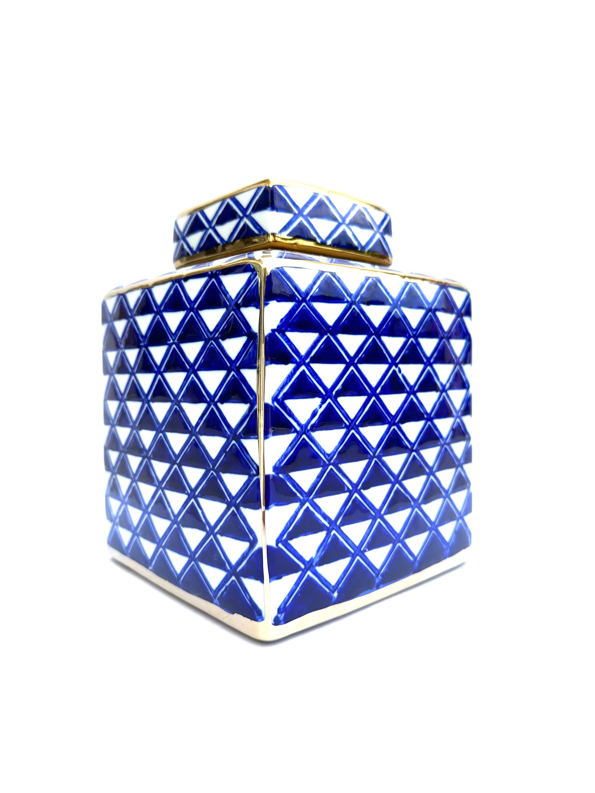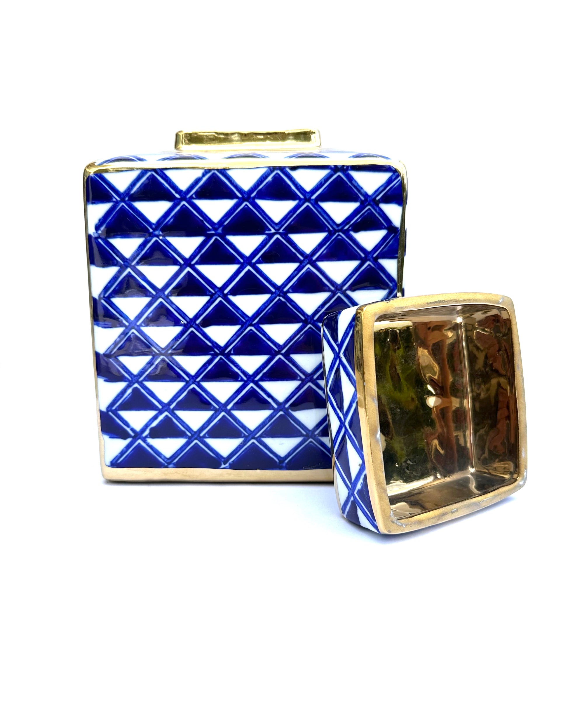 In cobalt blue with gold detailed rimmed edge, this hand glazed lidded jar makes a statement tabletop decorative piece.  Use as a standalone piece in any room or for use as a storage jar.