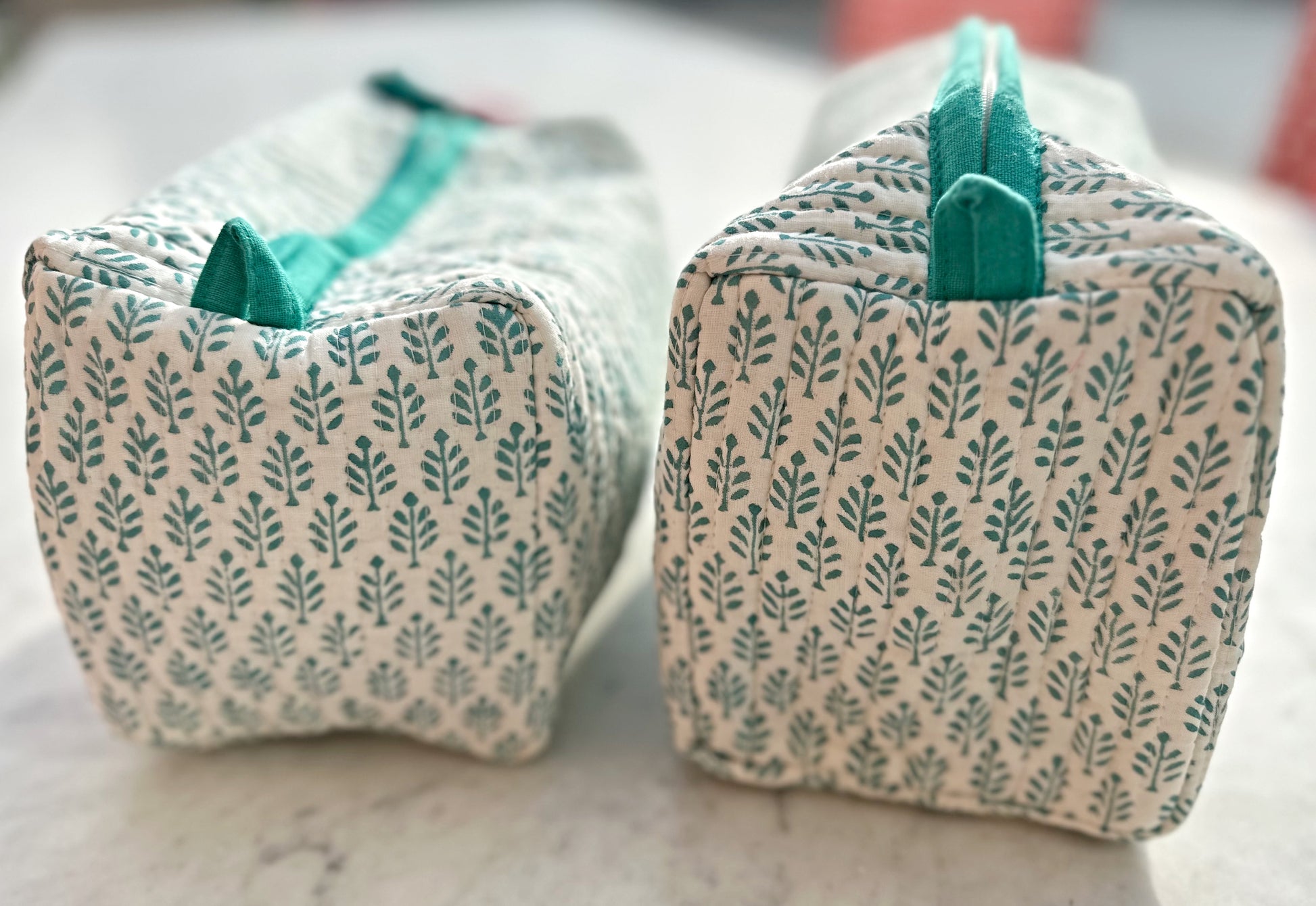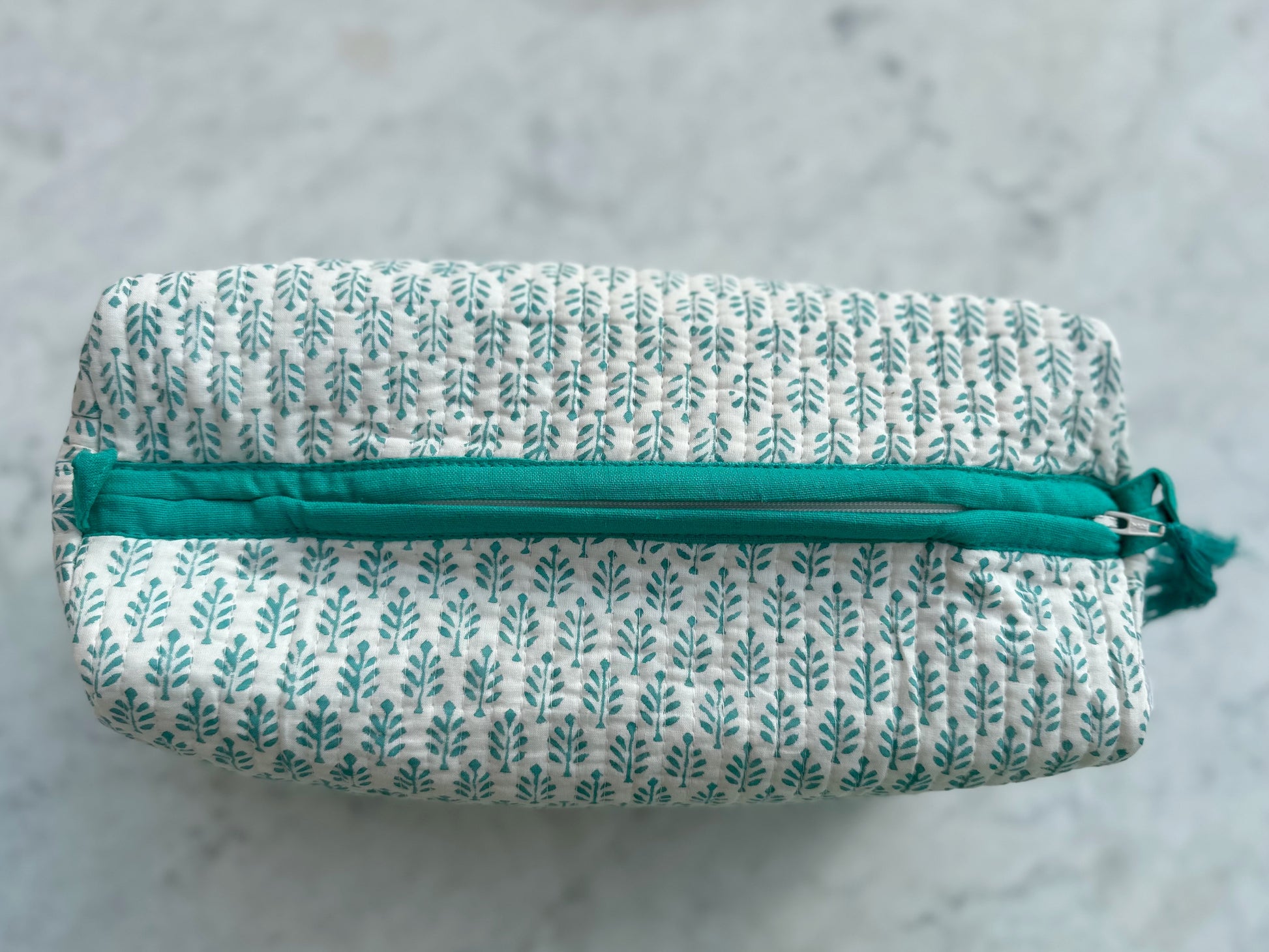 Cotton Quilted Cosmetic bag with inner plastic lining for water resistance. Easy to clean and wipe.