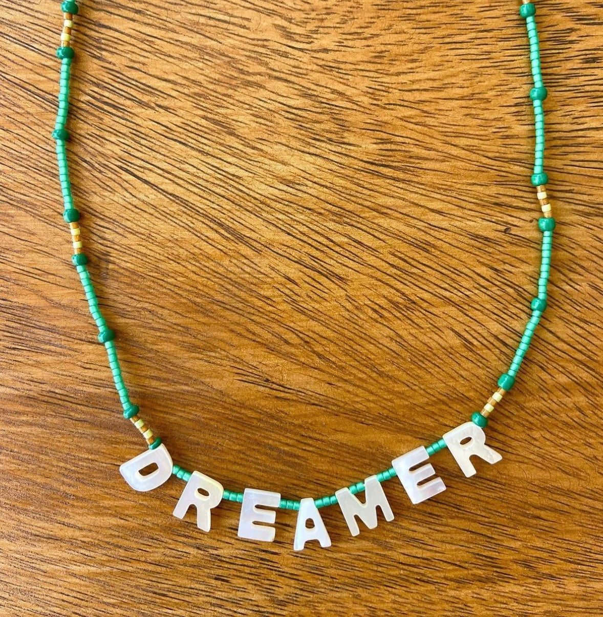 Single strand beaded necklace in blue tones with pearl letters spelling DREAMER and a gold plated closure.