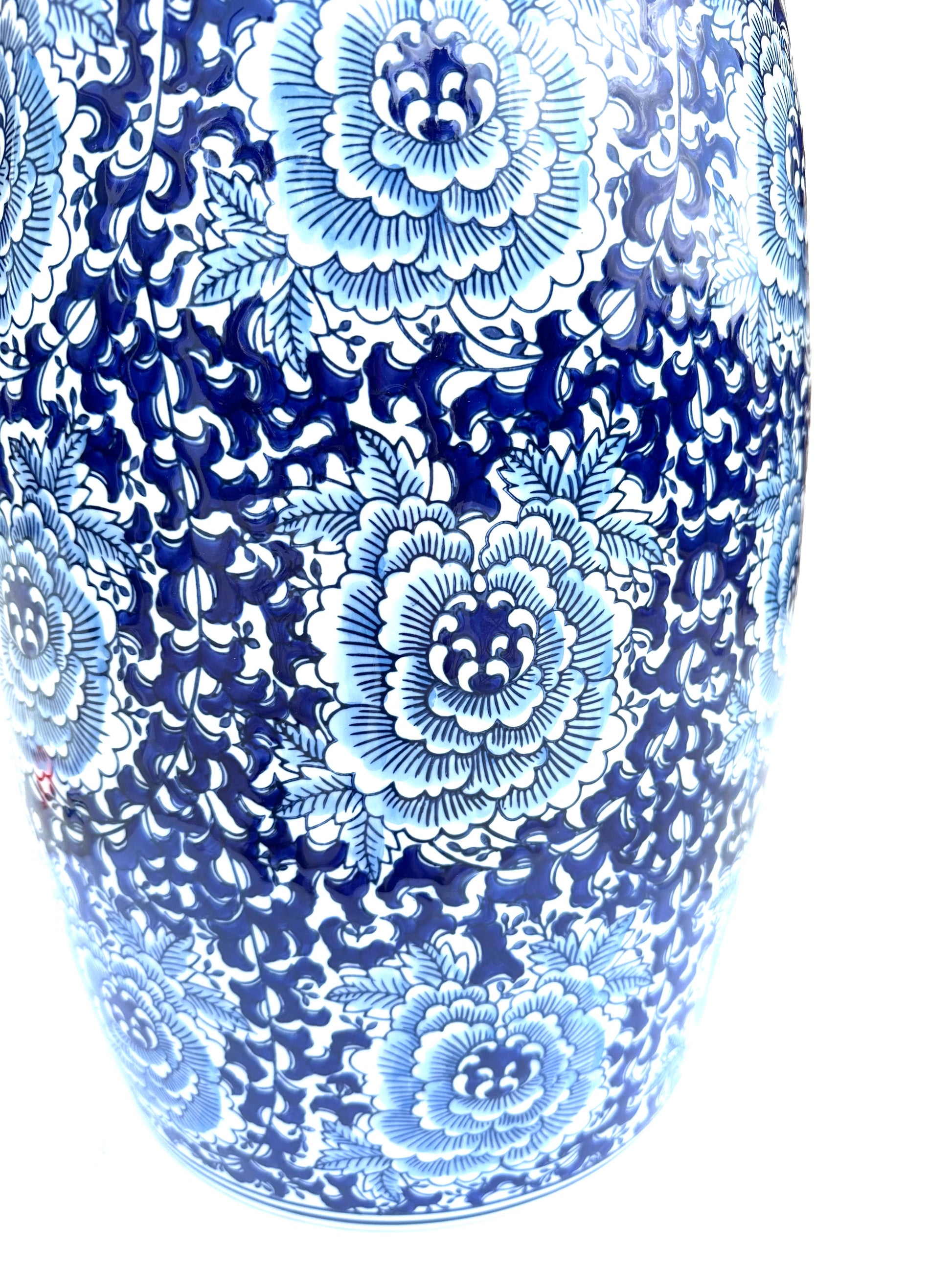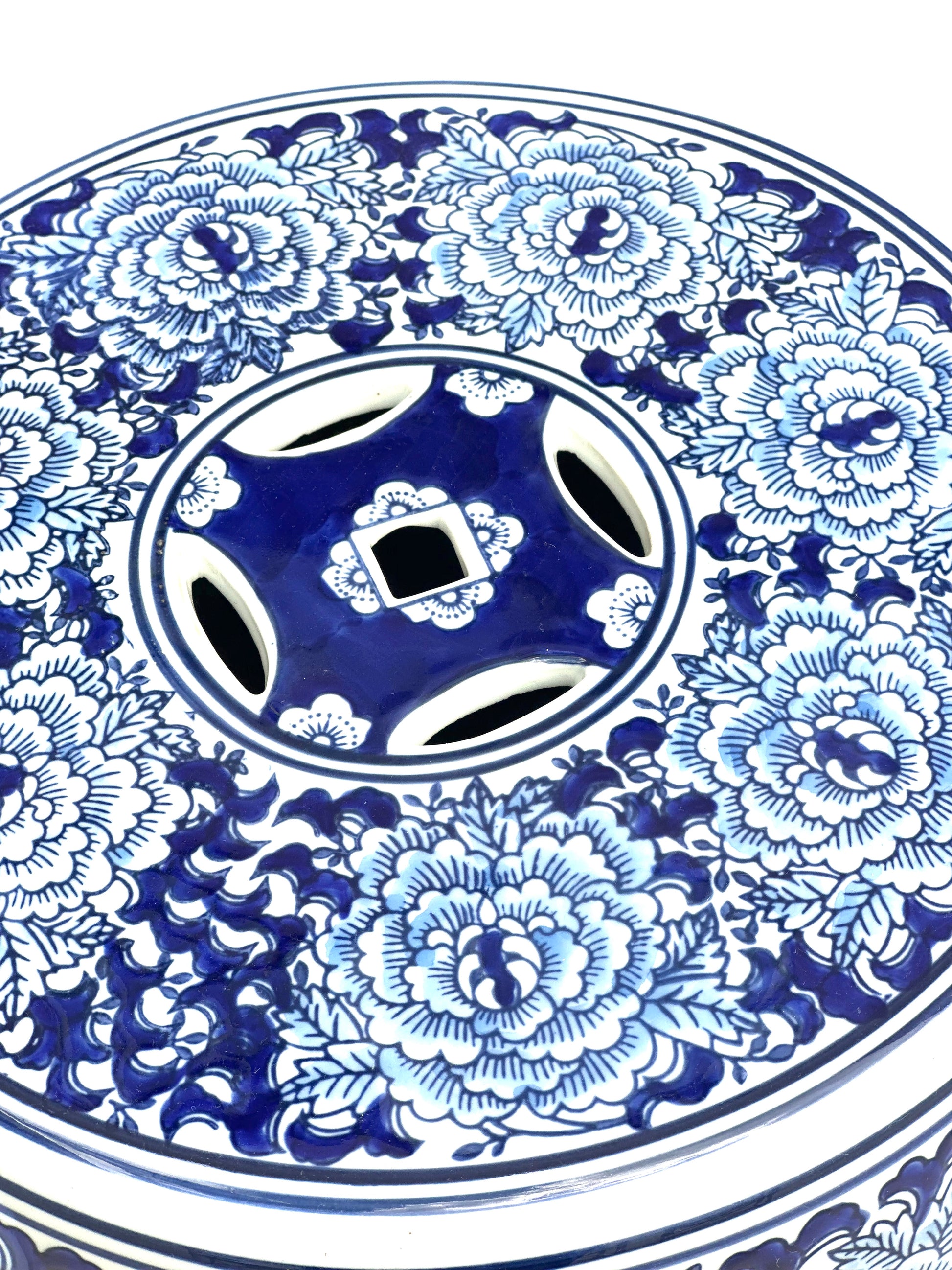 Porcelain stool glazed in a classic blue decorative design. For use as a garden stool in ancient China and today.  This decorative piece can be used indoors or outdoors as an extra seat, small table, plant stand or as an end table.