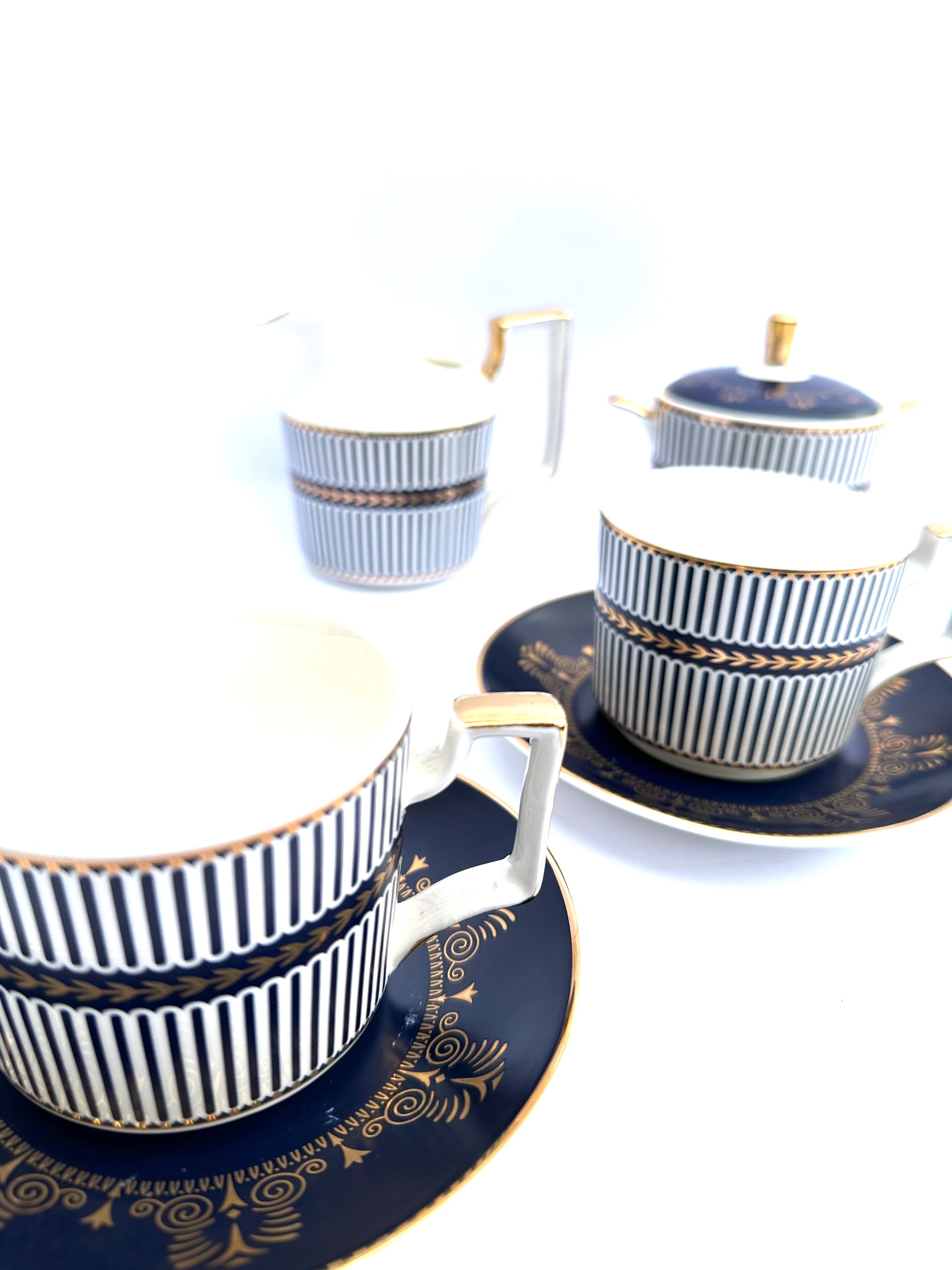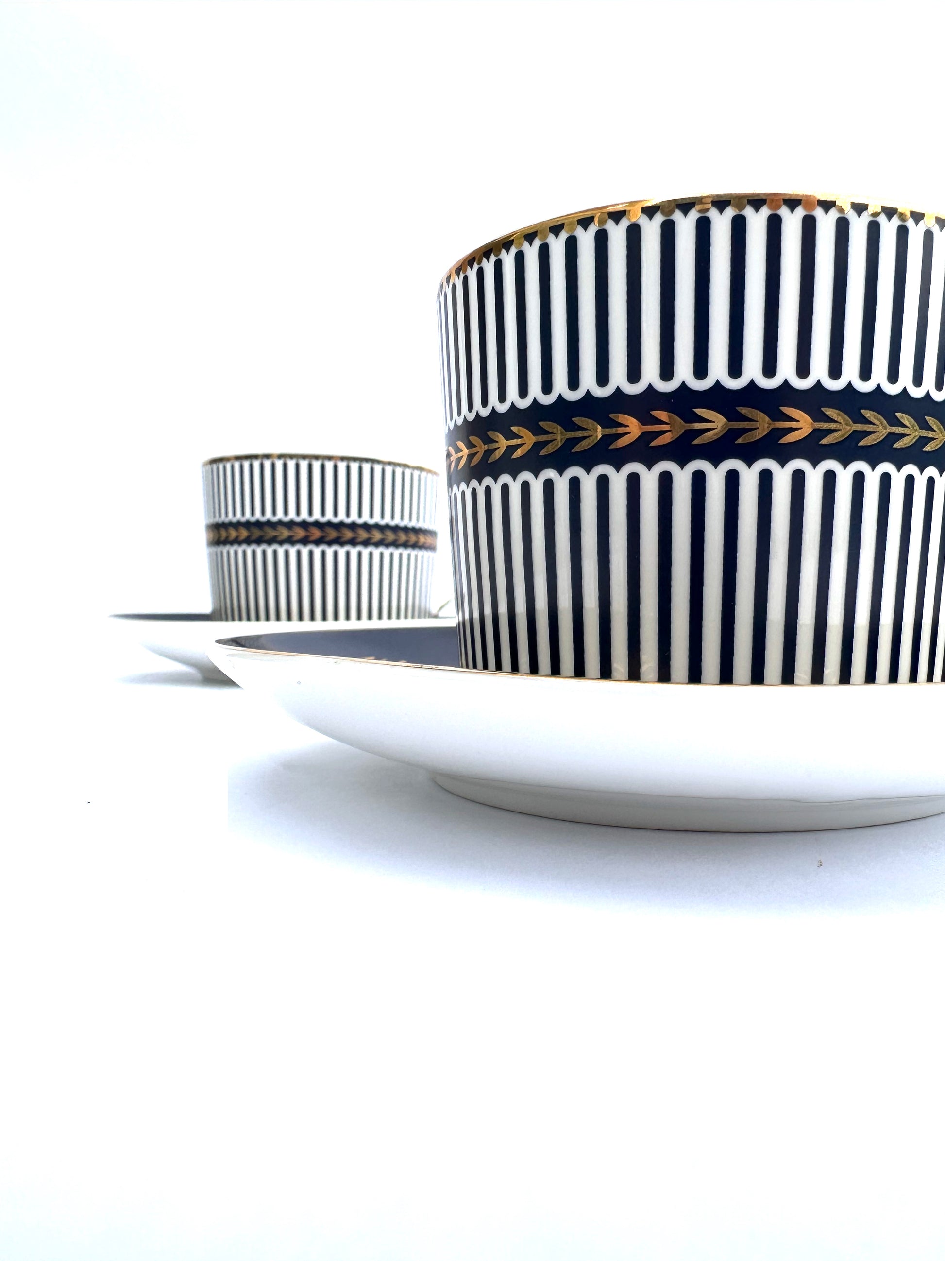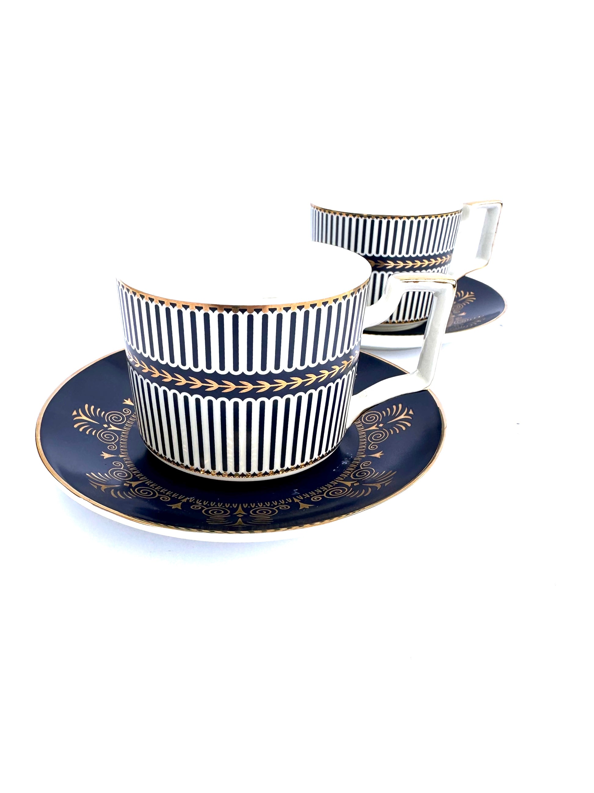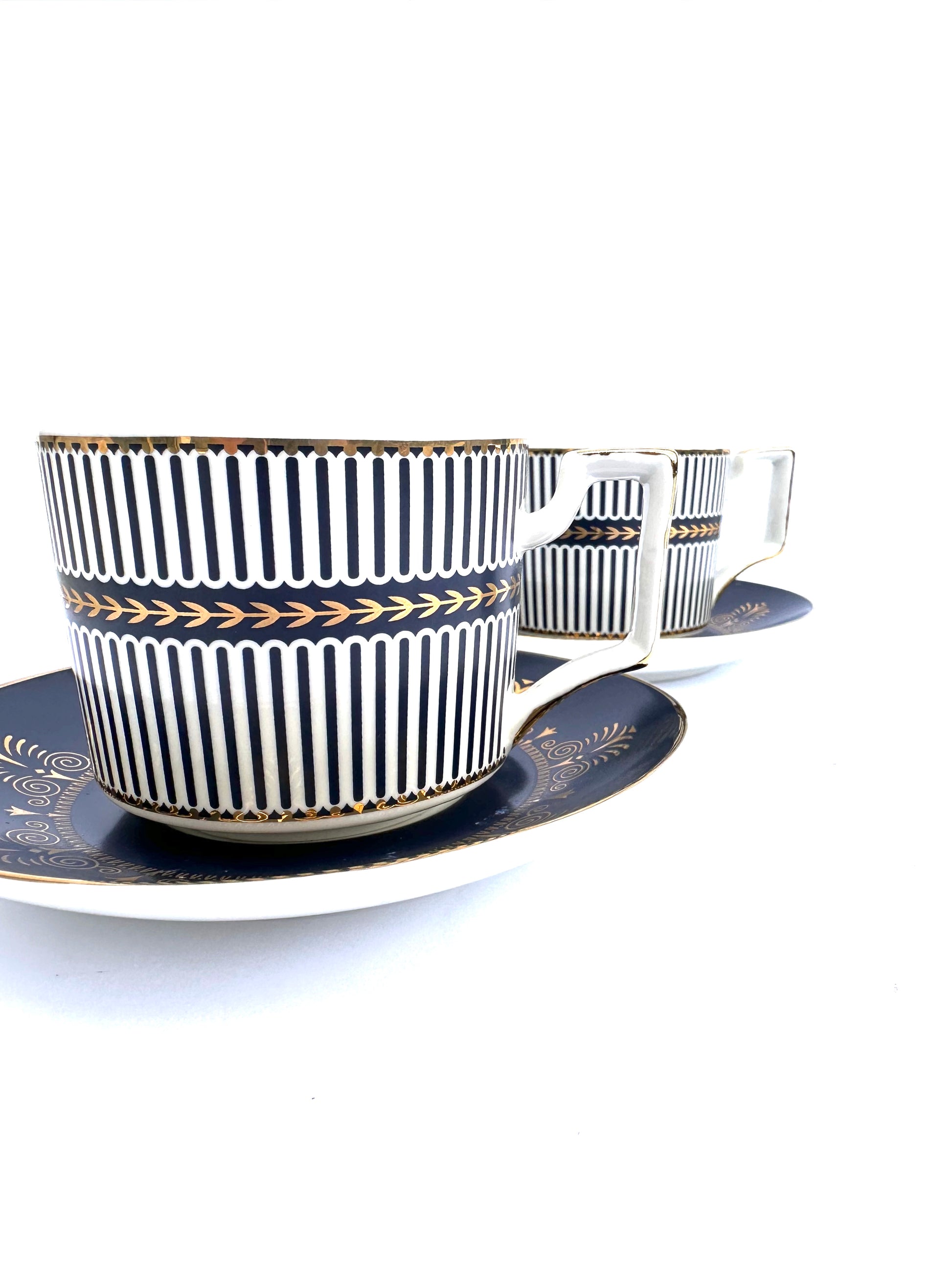 Timeless cup and saucer adorned in a classic design of gold decal rimmed edges on a navy and white background.