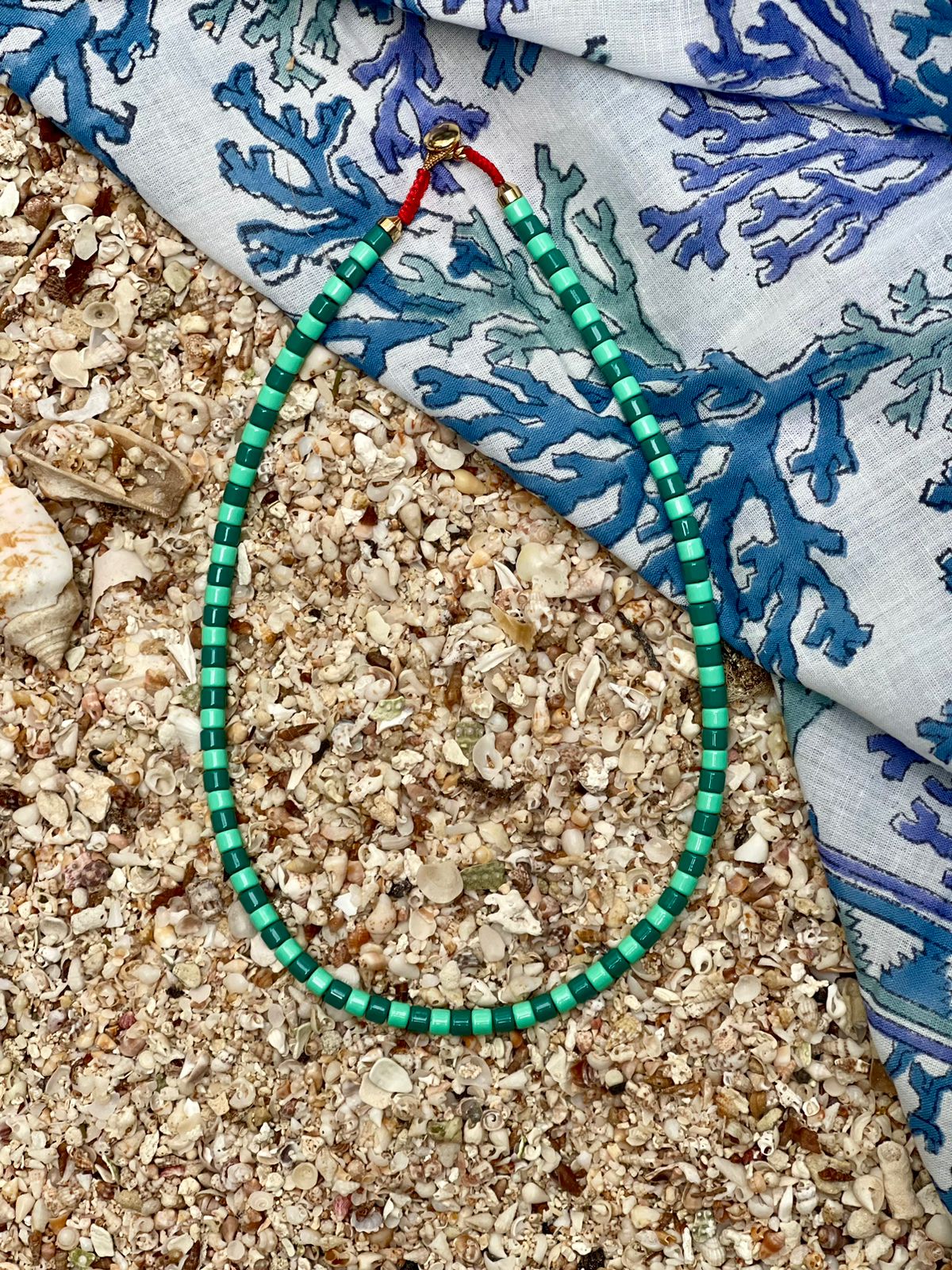 Single strand green beaded necklace with goldplated closure. Perfect for layering.