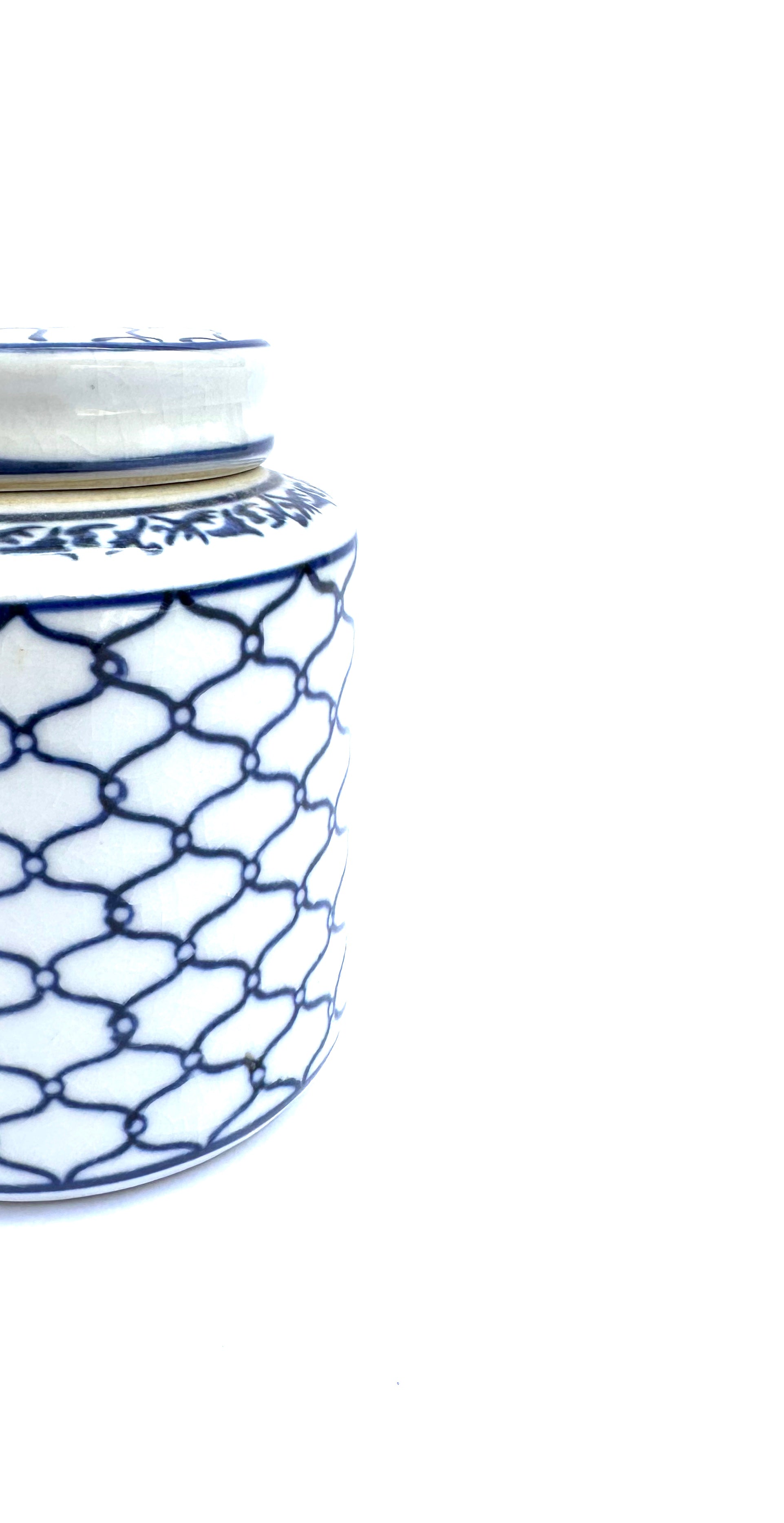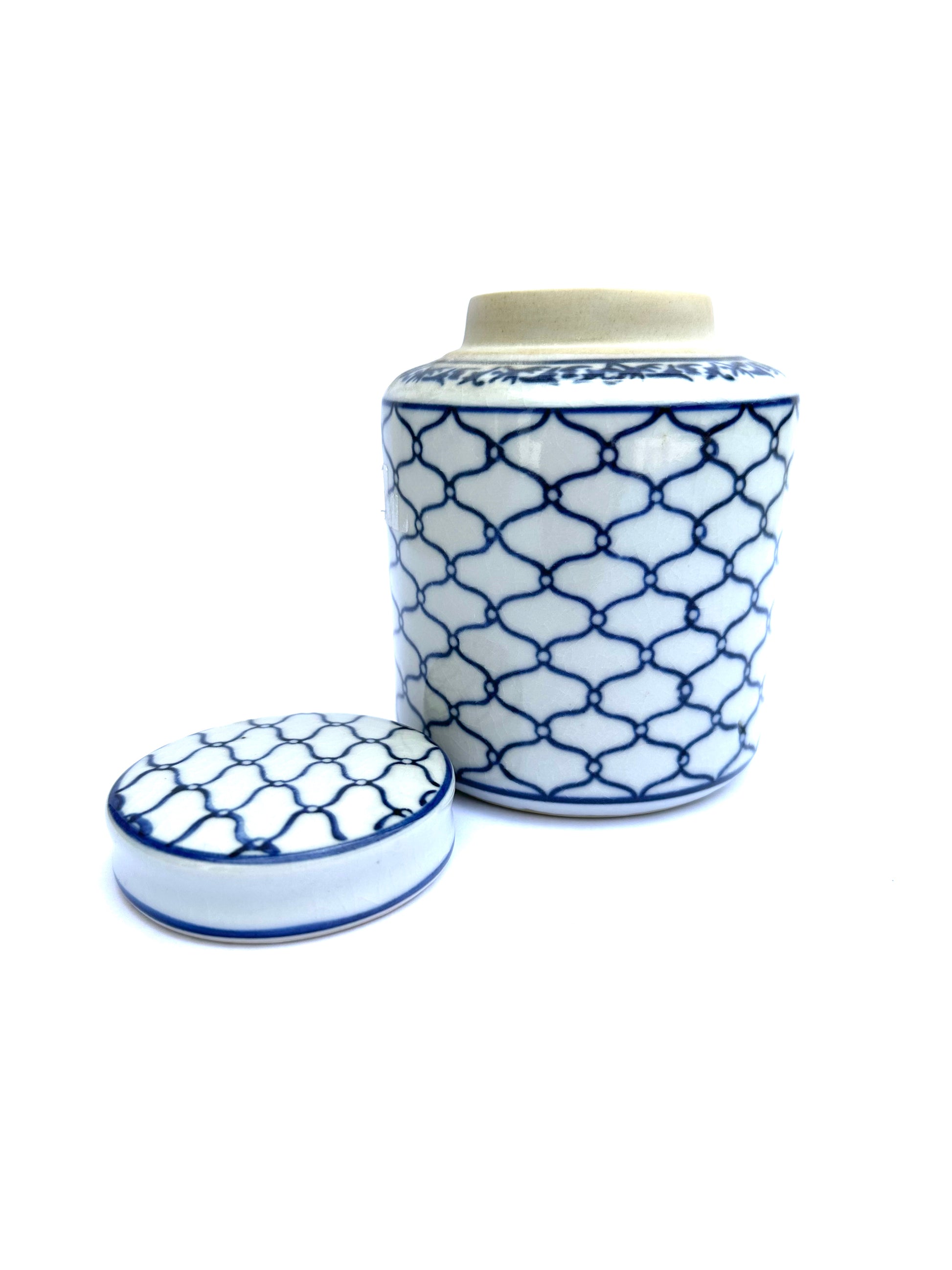 Classic link design hand glazed in deep blue lidded jar.  Use this jar as a tabletop decorative piece or as storage for smaller items.