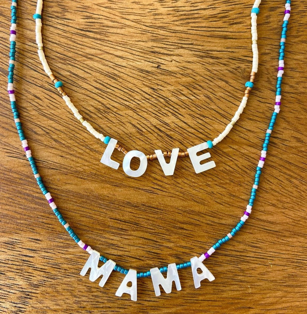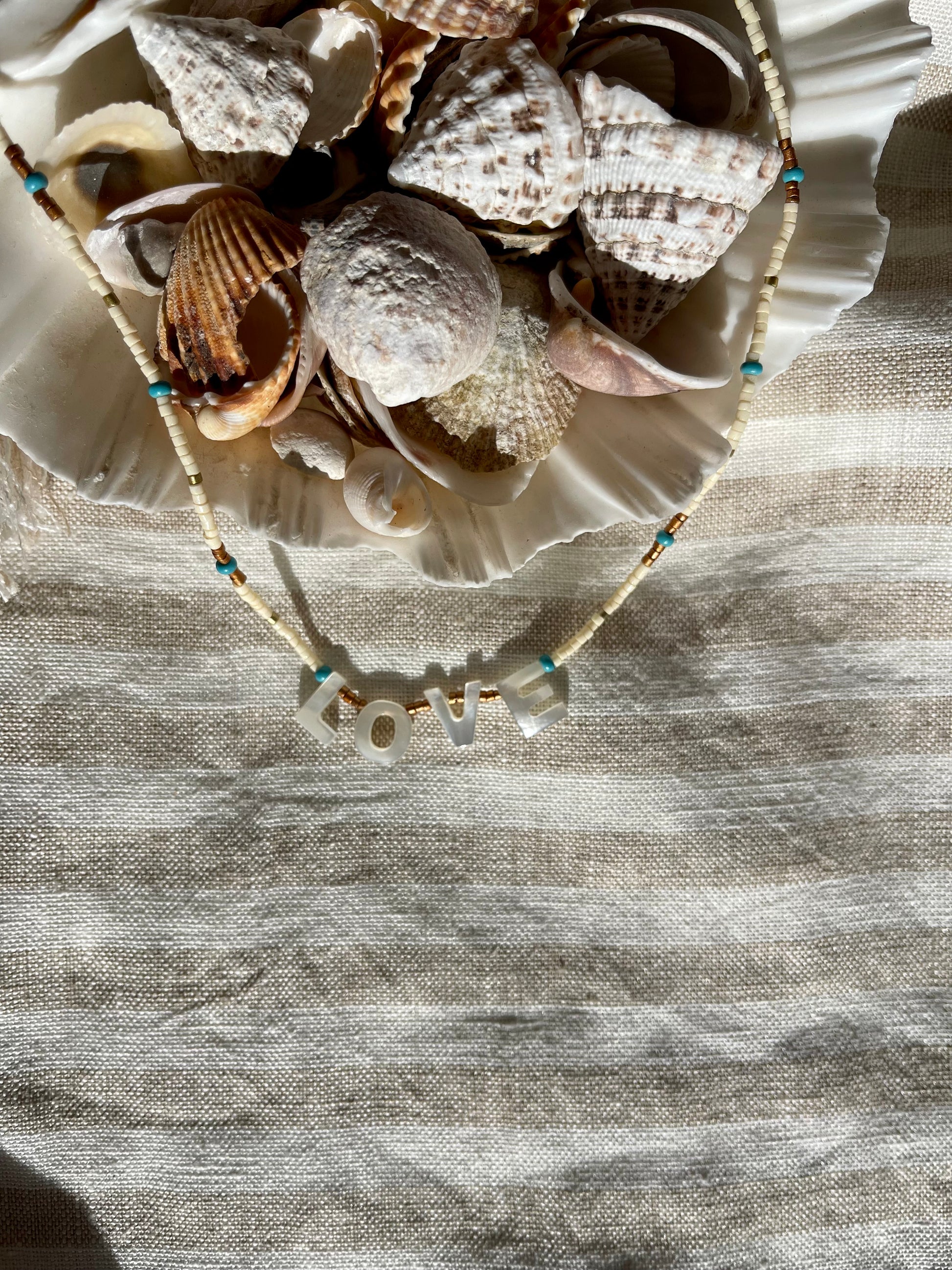 Single strand beaded necklace in blue tones with pearl letters spelling LOVE and a gold plated closure.