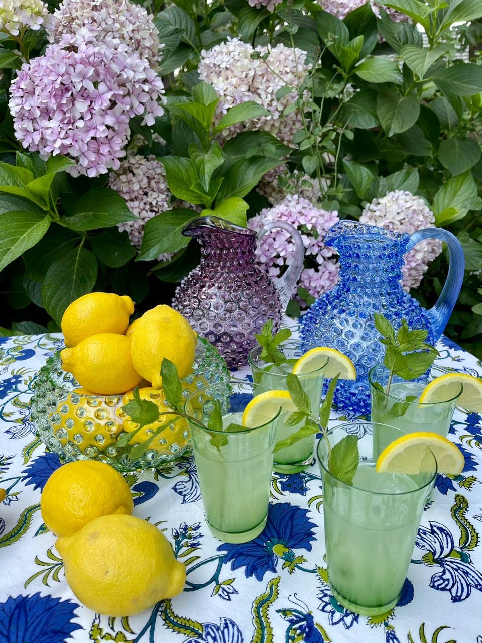 Glass tumbler with misty-effect and hammered design.