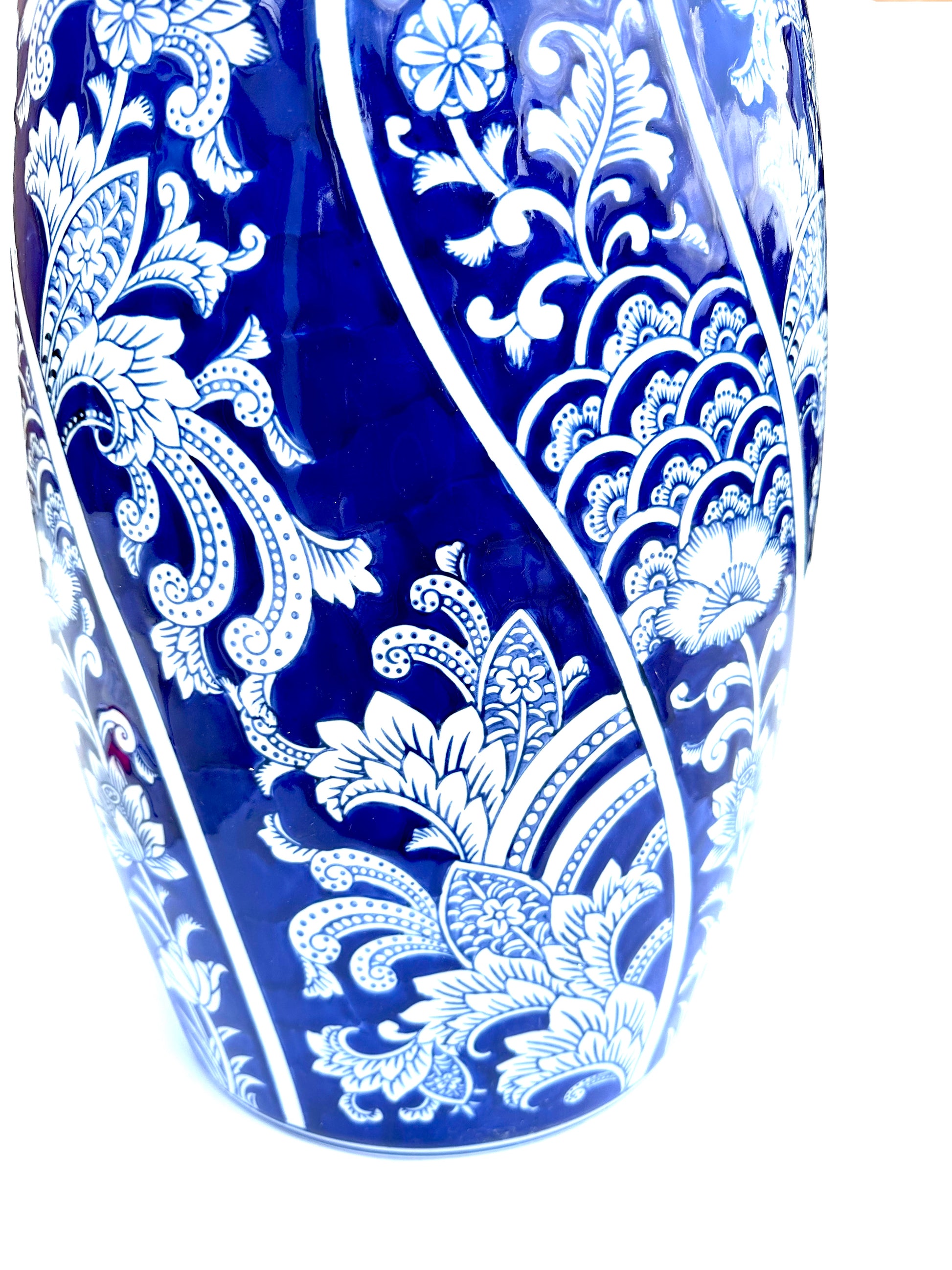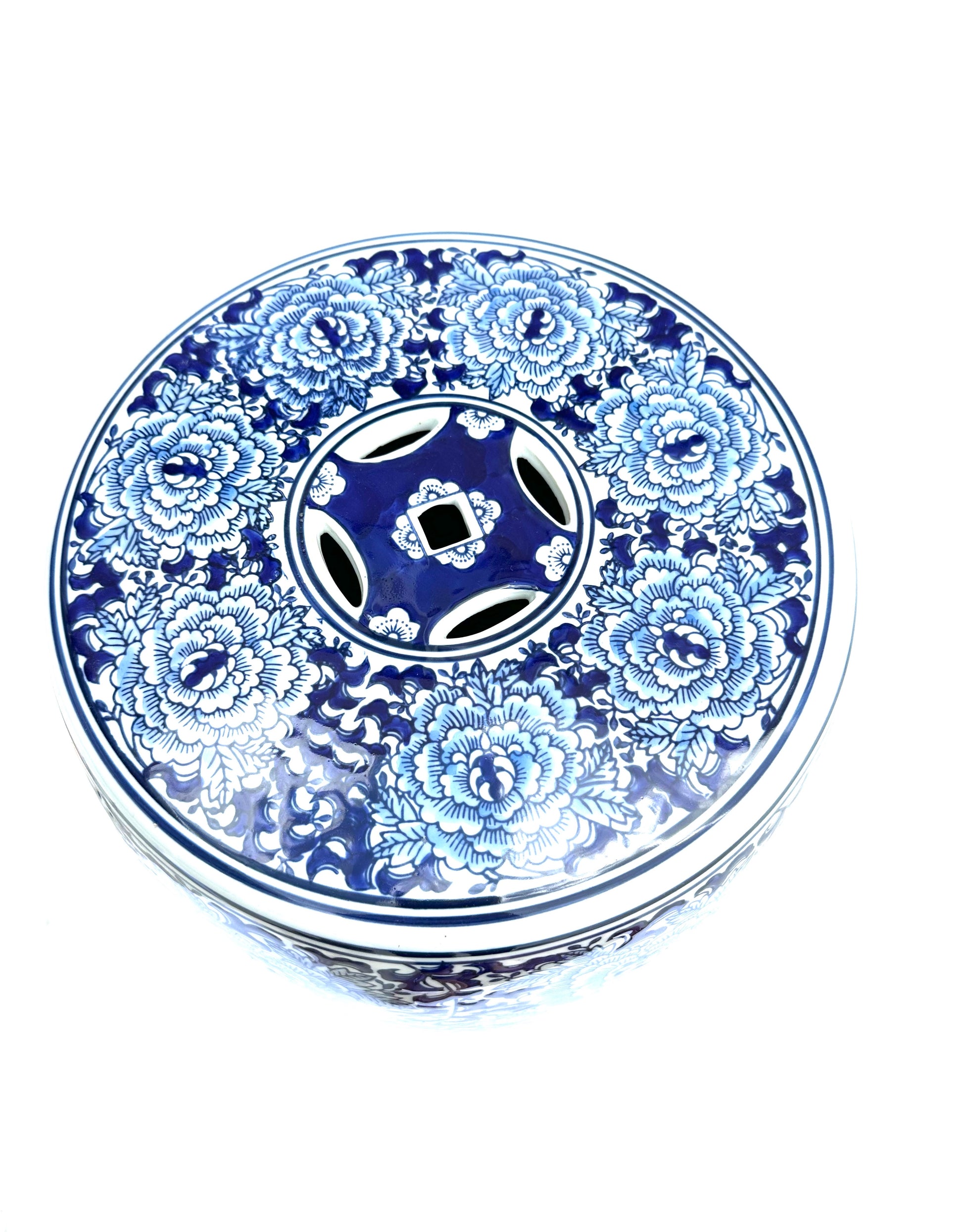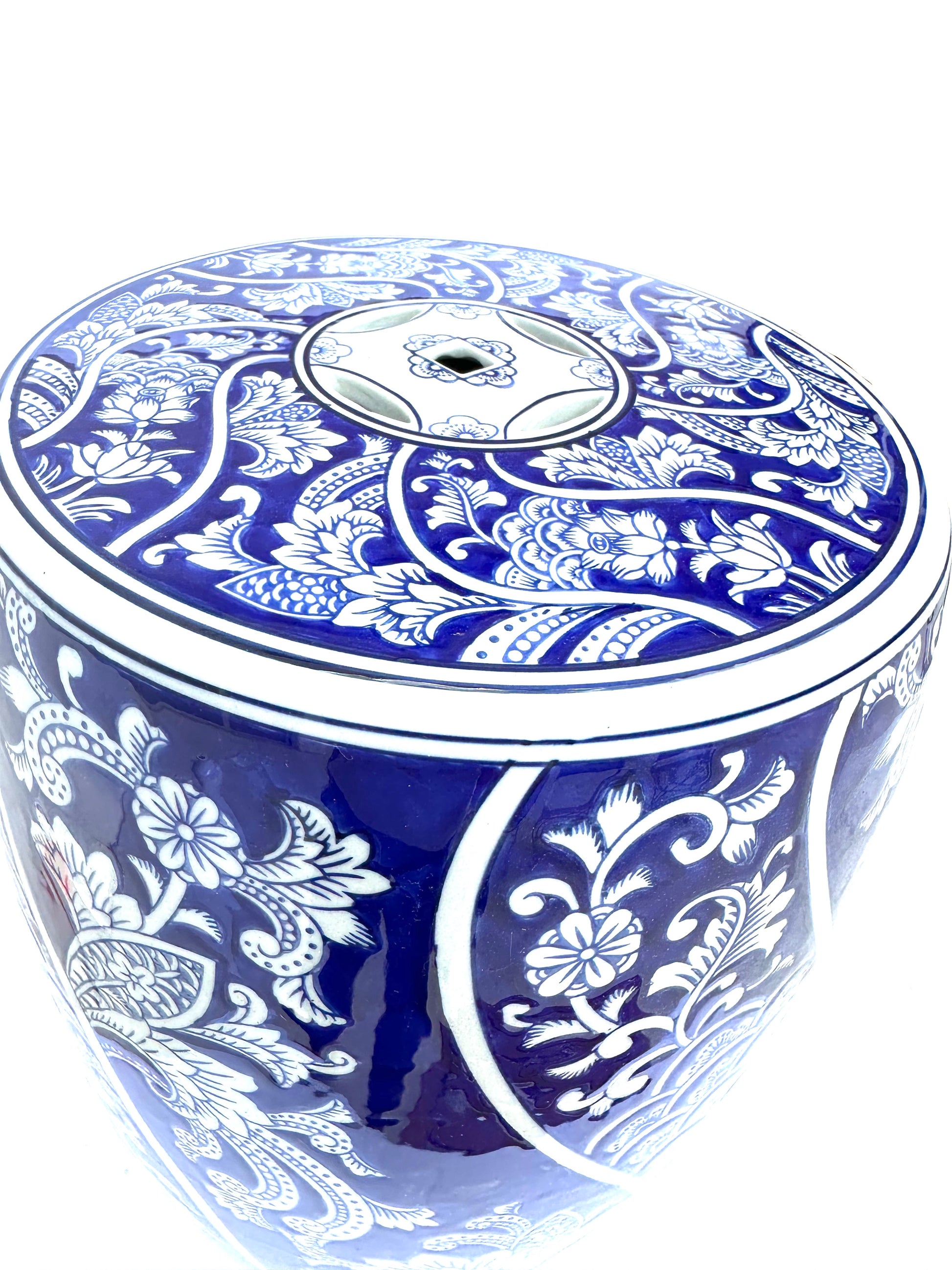Porcelain stool glazed in a traditional oriental blue and white design with floral vines.  For use as a garden stool in ancient China and today.  This decorative piece can be used indoors or outdoors as an extra seat, small table, plant stand or as an end table.