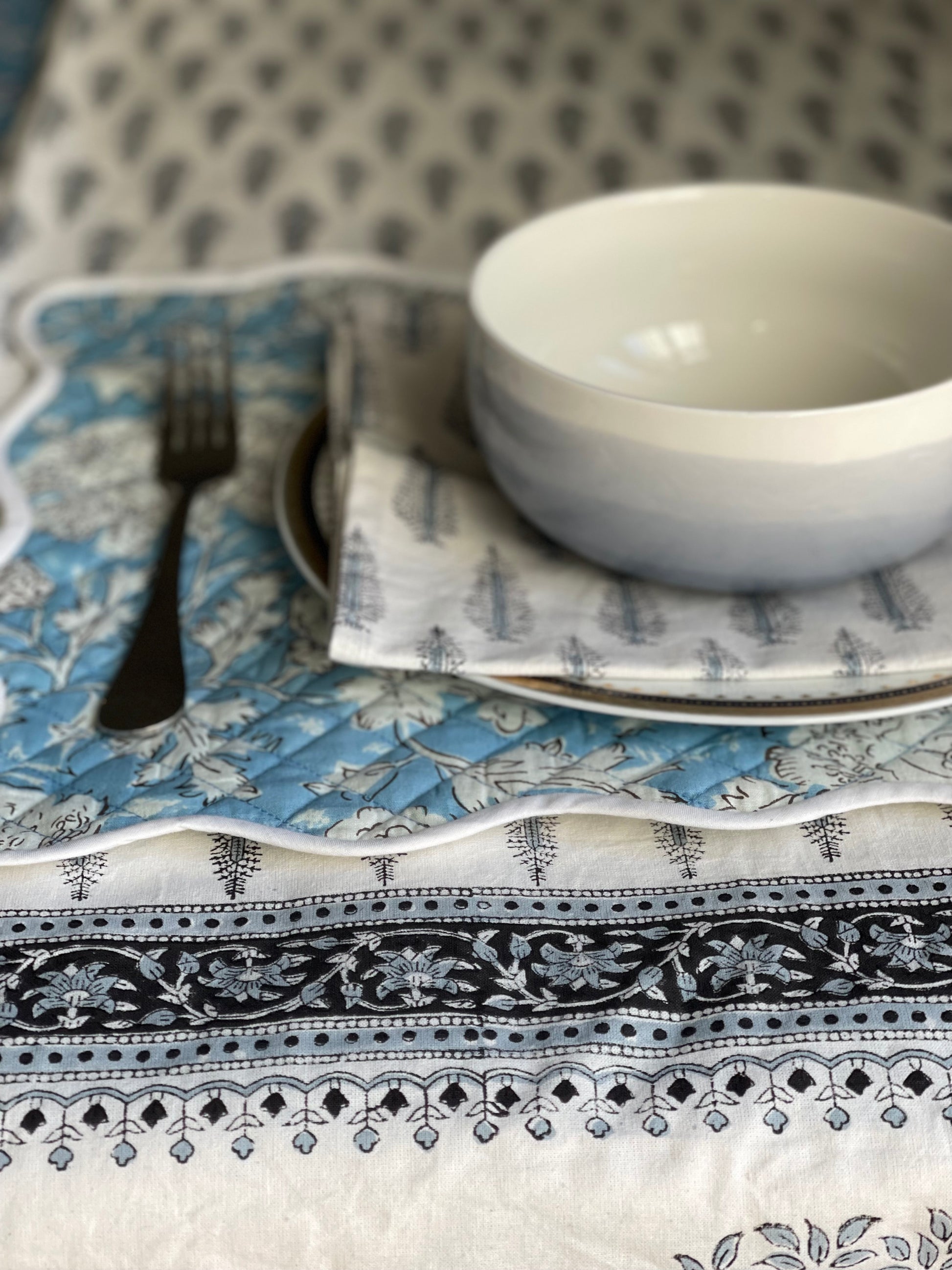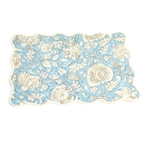 Handmade, blue Scalloped 100% cotton padded placemat. The placemat has a floral design on the front. The edges are scalloped with a lining and the mat has a fusing in between to bring a study and solid finish to your table.