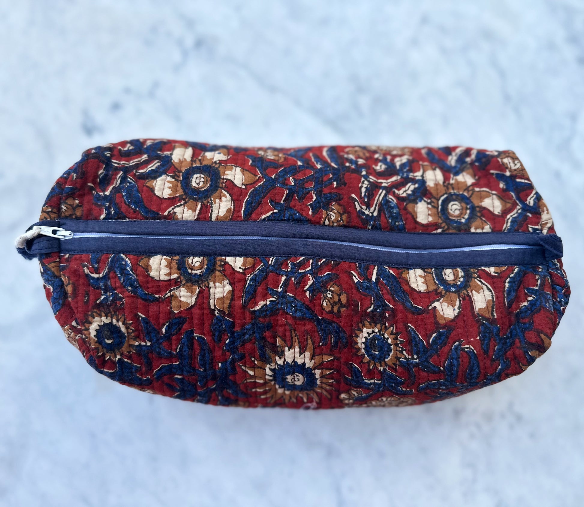 Cotton Quilted Cosmetic bag with inner plastic lining for water resistance. Easy to clean and wipe.