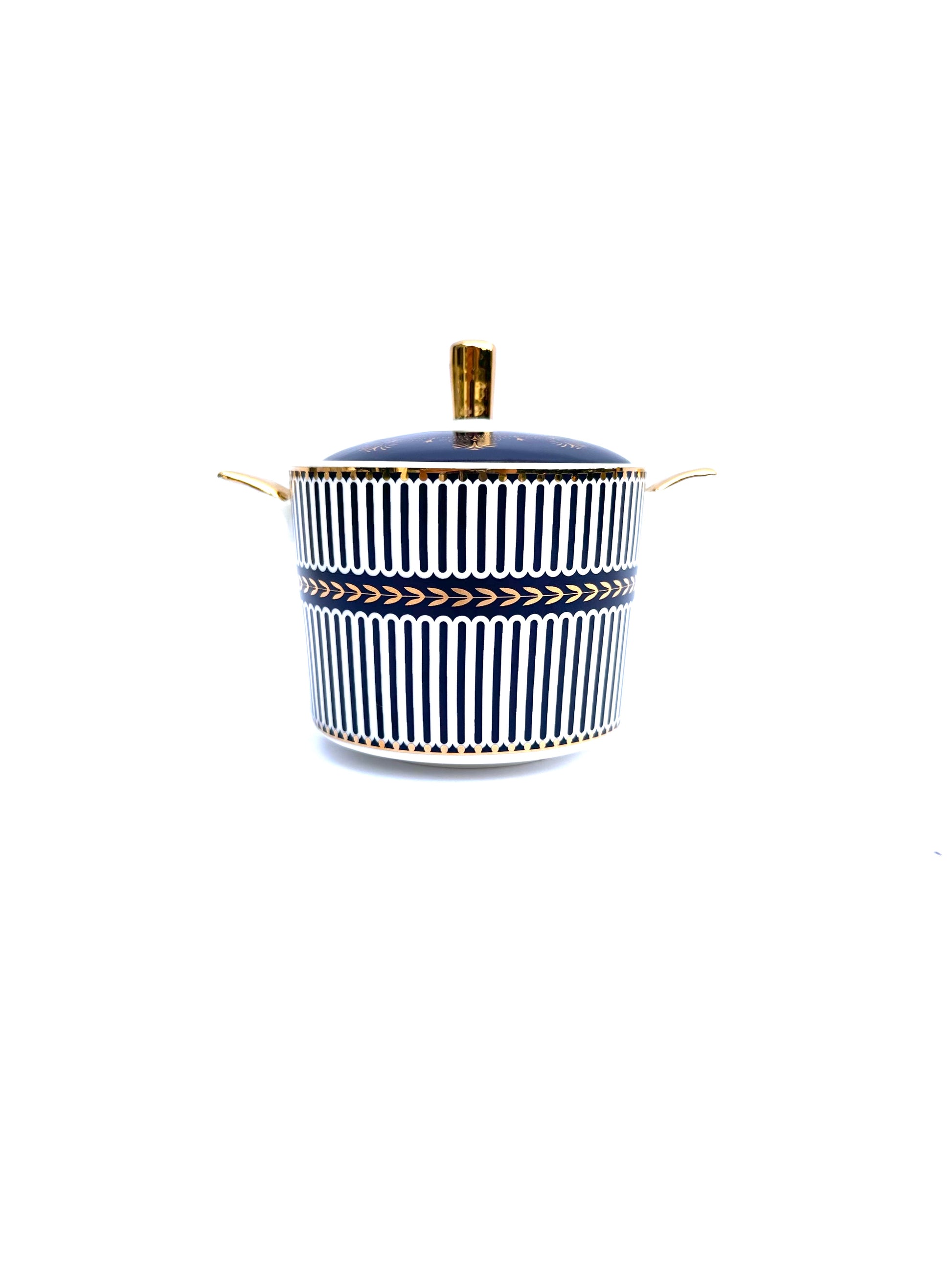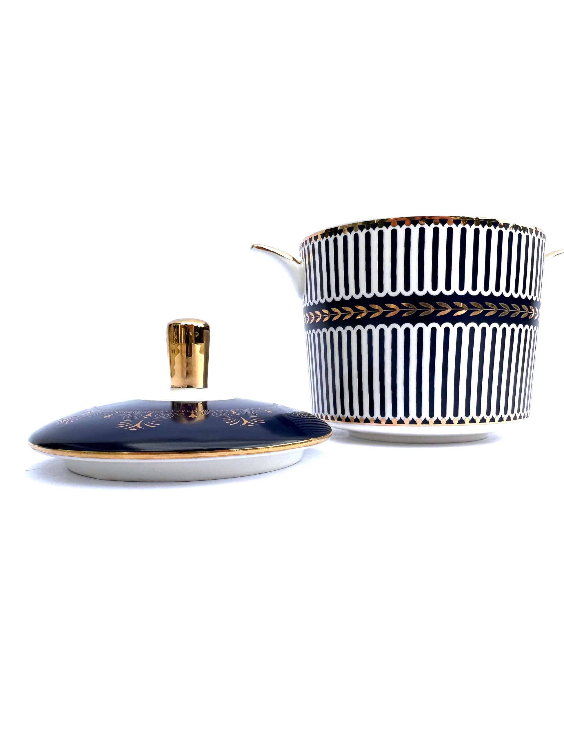 Sugar bowl in a timeless classic design. Gold decal rimmed edges on a navy and white background.
